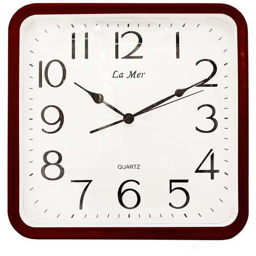 настенные кварцевые часы в квадратном корпусе из пластика. Классические настенные часы квадратной формы. Производители часов южнокорейской фирмы La Mer предлагают Вам широкий ассортимент великолепных интерьерных изделий в оригинальном дизайнерском исполнении, высокого уровня функциональности, качества и доступной стоимости. Часы La Mer станут превосходным украшением любого интерьера. Тип механизма: кварцевый. Тип батареи: от батарейки. Требуется 1 батарейка АА. Ход часов: плавный, бесшумный. Стекло на циферблате: есть стекло. Материал корпуса: качественный пластик. Цвет корпуса: коричневый. Форма корпуса: квадратные. Цвет циферблата: белый. Индексация: большие арабские цифры. Стрелки: часовая, минутная и секундная. Габариты изделия см): 36x36x5,1. Страна изготовитель: Южная Корея. Гарантия: 1 год.
