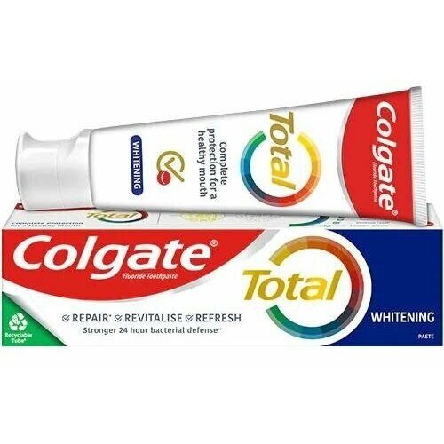 Наслаждайтесь ослепительно белоснежной улыбкой и полной защитой зубов и всего рта при чистке зубной пастой Colgate Total Whitening Toothpaste . Благодаря двойной формуле цинка и аргинина эта отбеливающая зубная паста обеспечивает потрясающую антибактериальную защиту на 24 часа. Более того, эта антибактериальная зубная паста также защищает от кариеса, удаляет налет, оживляет десны, укрепляет и восстанавливает эмаль. Он также уменьшает зубной камень, защищает чувствительные зубы, освежает дыхание и эффективно удаляет пятна, делая улыбку белоснежной. Чистите зубы два раза в день зубной пастой Colgate Total Whitening Toothpaste для уверенной и белоснежной улыбки, которой вы сможете гордиться. Превосходное сокращение количества бактерий на зубах, языке, щеках и деснах по сравнению с неантибактериальной зубной пастой с фтором при постоянном использовании 2 раза в день через 4 недели. Invitro на ослабленной эмали, вызванной пищевыми кислотами.