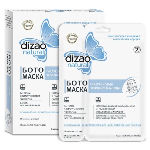 Двухэтапная ботомаска. Питание на клеточном уровне, повышение тургора кожи, разглаживание мимических И возрастных морщинИдеальный вариант для поддержания кожи в тонусе Ботомаска для лица, шеи и век с гиалуроновым заполнителем морщин. Это комплексный косметический продукт, который выполняет сразу несколько задач благодаря сбалансированной формуле и активным ингредиентам.Форма: лицо, шея, векиСпециальная форма маски для лица, разработанная DizaoМаска идеально покрывает все проблемные зоны вокруг губ кисетные морщинки), глаз гусиные лапки), подбородка и шеиЭластичное лекало удобно адаптируется под форму вашего лицаДополнительные лепестки для век можно использовать как под глазами, так и поверх векМаска полностью закрывает зону подбородка и шеиЧастицы гиалуронового заполнителя под влиянием ботогеля увеличиваются в объеме. Гиалуроновый филлер проникает внутрь возрастных и мимических морщин и заполняет их изнутри. Гиалуроновое восстановление кожи начинается с первых минут применения ботомаски и ботогеля.Действие маски:Устранение мимических морщин и предотвращение их повторного появленияВосполнение дефицита аминокислот, витаминов и минераловЛифтинг проблемных областейAntiage эффект на клеточном уровнеУвлажнение и антиоксидантный эффектВыравнивание рельефа кожиВосстановление эластичности кожи
