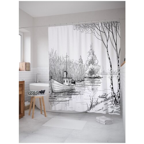 Штора занавеска) для ванной JoyArty Лодка по реке из сатена, 180х200 см с крючками