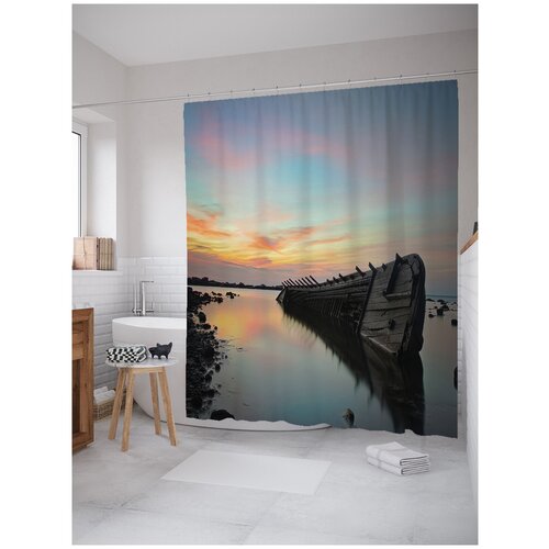 Штора занавеска) для ванной JoyArty Морской рассвет из сатена, 180х200 см с крючками