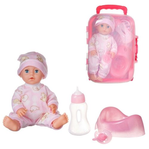 Любая девочка будет рада получить в подарок этого очаровательного пупсика. Он одет в красивый мягкий комбинезон, у него есть горшок, бутылочка и соска. Пупсика с аксессуарами удобно хранить в стильном чемоданчике с ручками и прозрачной крышкой. Его всегда можно взять с собой. Комплектность: кукла, горшок, бутылочка, соска, чемоданчик.