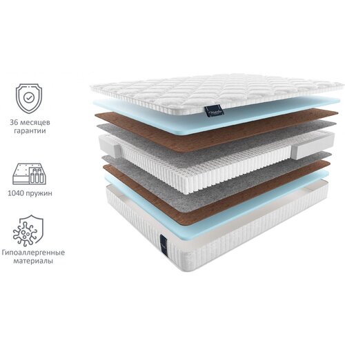 Кому подходит данная модель: идеально подойдет людям, которые заботятся о правильном и ровном положении тела во время сна; парам со значительной разницей в весе; универсальная модель, подходящая всем возрастным группам.Уникальный матрас Таормина кокос с одинаковыми сторонами жесткости.Матрас выдерживает достаточно внушительный вес, вплоть до 140 килограммов.Данная модель обладает умеренной жесткостью, которая достигается благодаря сочетанию пены natural foаm и латексированого кокоса. Латексированный кокос с каждой стороны придат дополнительную жесткость. Прослойка из 100 натурального термофиксированного фетра гарантирует наджность и продлевает жизнь любого матраса.В основе матраса лежит независимый пружинный блок Multipосket в файбертексе, который обеспечивает максимальную долговечность и длительный срок службы. Данный пружинный блок дарит телу спящего оптимальную поддержку.Матрас может изготавливаться в разных чехлах. Список доступных чехлов доступен в сопутствующих товарах.