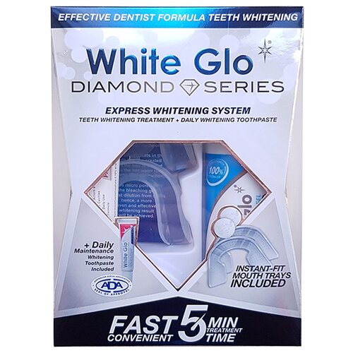 Система экспрессотбеливания White Glo Diamond Series начнет действовать всего через пять минут и подарит вам потрясающую улыбку в самые короткие сроки.Революционно быстрая и эффективная формула средства для отбеливания зубной эмали обеспечивает не только потрясающую белизну зубов, но и длительный эффект, который не сойдет после первого приема красящей пищи.Средство абсолютно безопасно отбеливание зубов происходит без механического воздействия. Пользуйтесь и не беспокойтесь об истончении эмали.В комплекте системы экспрессотбеливания идет отбеливающий гель, индивидуальная капа 2шт), отбеливающая зубная паста.Эффективно удаляет пятна, вызванные употреблением красящей пиши, желтизну, пятна вызванные старением зубной эмали.