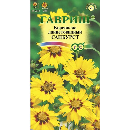 Кореопсис Санбурст, ланцетовидный. 0,1 гр.)Красивоцветущее многолетнее травянистое растение высотой до 90 см. Стебли прямостоячие, ветвистые. Листья расположены супротивно, пальчатораздельные или перисторассеченные. Цветки махровые и полумахровые около 6 см в диаметре. Размножается семенами, делением куста, самосевом. Посев проводят в апрелемае в открытый грунт, можно сеять под зиму. Цветет с июля в течение 6070 дней. После цветения растения подрезают, это увеличит его устойчивость к морозу. Раз в 34 года растения рекомендуется делить и пересаживать, что лучше делать осенью. Кореопсисы благодарные, обильно и продолжительно цветущие растения. Используютcя для посадки сборных цветников, группами на газонах, в качестве фоновых растений, с южной стороны оград и древеснокустарниковых насаждений. Они к тому же очень хороши для срезки, в воде цветы стоят дольше недели.