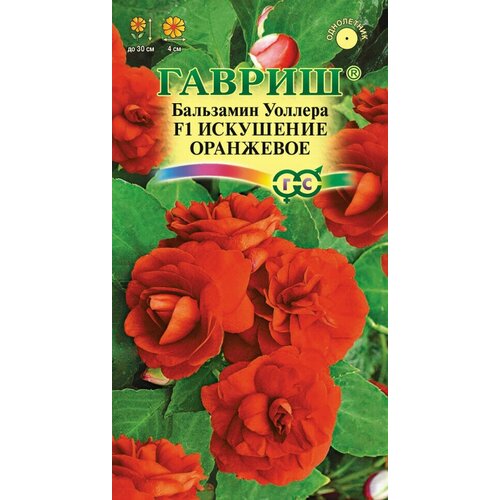 Гавриш, Бальзамин Искушение оранжевое F1 Уоллера), по 4 шт, Однолетнее растение. Куст шаровидной формы высотой 2530 см и диаметром 1015 см. Листья темнозеленые. Растение усыпано крупными, диаметром 4 см, махровыми цветами оранжевой окраски. Цветет с июня до заморозков. Растение неприхотливое. Хорошо растет в полутени. Предпочитает легкие плодородные почвы. Достаточно влаголюбиво, но не переносит избыточного переувлажнения. Размножают семенами, посев которых производят в мартеапреле в рассадные ящики. Посевы засыпают влажным песком слоем 3 мм и поддерживают постоянную влажность, для чего емкость накрывают стеклом и ставят в хорошо освещенное место. Всходы появляются через 1420 дней. После появления всходов, влажность субстрата и воздуха необходимо уменьшить, сняв покровное стекло. Сеянцы, достигнув высоты 1 см, пикируют в горшки по одному растению. На открытый балкон растения выставляют в середине мая. Используют для украшения контейнеров, висячих корзин и клумб, можно выращивать как комнатное растение. Вид: Impatiens walleriana