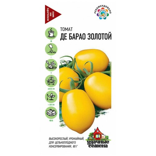 Среднеспелый 115120 дней от всходов до созревания) высокорослый сорт для пленочных и остекленных теплиц или для выращивания в открытом грунте в более южных регионах). Растение сильноветвистое, сильнооблиственное, высотой более 2 м. Требует подвязки и пасынкования. Первое соцветие закладывается над 911 листом, последующие через 3 листа. Плод овальный, гладкий, окраска незрелого плода зеленая, с темным пятном, зрелого желтая. Товарная урожайность 6,26,4 кгм2. Масса плода 8083 г. Вкус хороший. Ценится за высокую урожайность, хорошие вкусовые и технологические качества плодов. Рекомендован для употребления в свежем виде и цельноплодного консервирования. Удачные семена, Томат Де барао золотой 0,05 грамм