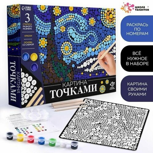 Любите раскрашивать картины по номерам Попробуйте новый необычный вид творчества рисование точками. В этом наборе есть вс необходимое, чтоб создать такую оригинальную картину. Данный набор позволит вам создать репродукцию известной картины Звздная ночь Винсента Ван Гога в точечной технике.Польза занятий росписью по точкамТренировка моторики рук и глазомера.Кропотливое занятие росписью благотворно влияет на нервную систему детей и взрослых. Совет: для получения более точного оттенка можно применять чистый лист бумаги помимо пластиковой палитры. Регулируйте яркость оттенка водой.Что в наборе:основа с нанеснной схемой;3 деревянных стилуса;акриловые краски 7 цветов;пластиковая минипалитра для смешивания красок;схема смешивания цветов.Набор рекомендован для детей от 3 лет.