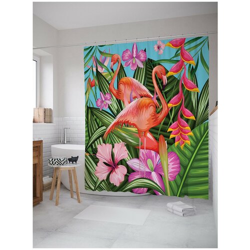 Штора для ванной, занавеска в ванную комнату JoyArty Фламинго в цветах из сатена, 180х200 см с крючками