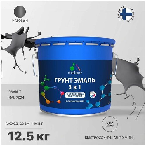 ГрунтЭмаль 3 в 1 Malare по ржавчине для металлических поверхностей, акриловая, быстросохнущая, матовая, RAL 7024, графитовосерыйтемный), 12,5 кг.
