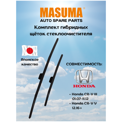 Гибридные щетки стеклоочистителя Masuma для Honda CRV III 20072012 Хонда ЦРВ 3). Крепление щеток 34;крючок34; смещено от цента как в оригинальных стеклоочистителях. Преимущества бескаркасных и каркасных щеток объединились в стильном корпусе гибридных щеток Masuma. Надежный корпус с рычагами обеспечивает плотное прижимание рабочей поверхности к стеклу, тем самым гарантируя эффективную очистку от влаги. Современный дизайн корпуса позволяет защитить внутренний каркас от снега и льда тем самым сохраняя функционал щетки в зимний период времени.