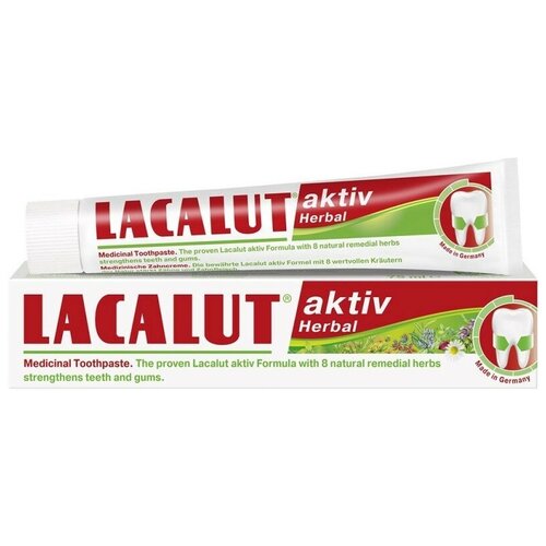 Зубная паста LACALUT aktiv Herbal с лактатом алюминия и 9 лекарственными травами укрепляет десны, оказывает вяжущий и противовоспалительный эффект, предупреждает развитие пародонтита и кровоточивости. Входящий в состав фторид натрия обеспечивает профилактику кариеса.Комбинация из 9 экстрактов и эфирных масел лекарственных растений мирра, эвкалипт, шалфей, ромашка, мята, тимьян, фенхель, анис, розмарин) комплексно заботится о здоровье полости рта и обеспечивает свежее дыхание надолго.Содержит 94,5 натуральных ингредиентов.Зубную пасту LACALUT aktiv herbal рекомендуется использовать курсами 3060 дней с интервалами между курсами 2030 дней. Для лучшего эффекта использовать в комплексе с ополаскивателем для полости рта LACALUT aktiv и зубной щеткой LACALUT aktiv.