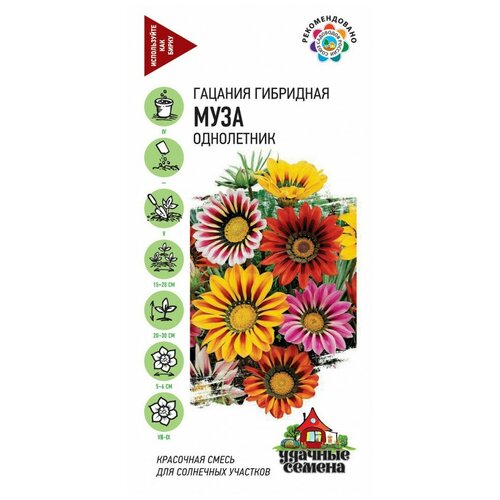 Удачные семена, Гацания Муза, крупноцветковая, смесь, по 0,05 г, Однолетнее растение высотой 20 30 см. Имеет прикорневую розетку листьев, из которой появляются изящные соцветия, очень напоминающие ромашку со слегка отогнутыми лепестками, имеющие разнообразную окраску. Соцветия открыты только в солнечную погоду. Выращивают рассадным способом. Всходы появляются на 10 14 день. Гацания очень любит солнце, умеренный полив и подкормки каждые 2 недели. Используют на клумбах, бордюрах, рабатках. Выращивают гацанию и как горшечную культуру. Вид: Gazania splendens L.