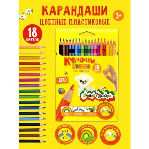 Цветные карандаши пластиковые 18 цветов КалякаМаляка отличный выбор для деток. Пластиковые карандаши для рисования в отличие от деревянных более устойчивы к поломке корпуса, ну а если он все же ломается, края остаются прямыми, без зазубрин это более безопасно.Наши детские цветные карандаши имеют уникальную особенность грифель в них такой же мягкий, как и в классических деревянных карандашах, мягкость 4М. Мягкие цветные карандаши имеют классическую шестигранную форму и грифель диаметром 3 мм. Точить такие карандаши сплошное удовольствие они точатся 34;единым34; полотном без мелких опилок. Рисунок получается очень ярким, насыщенным и устойчивым к выцветанию. Набор цветных карандашей для рисования прекрасно справляются с поставленными задачами, отличаются долговечностью и устойчивостью к износу, карандаши идеальны для школы и детского сада. Материал корпуса изготовлен из высококачественного пластика, диаметр 7 мм, длина карандашей для малышей классическая 176 мм.Милая упаковкаконверт с собачкой делает набор карандашей для детей отличным подарком для ребенка на день рождения, новый год, 1 сентября.Детская канцелярия и товары для творчества КалякаМаляка обожают маленькие непоседы, ведь наша канцелярия для детей яркая, веселая и вдохновляет на творчество! Дополните карандашики нашим желтым альбомом или раскраской и у Вас получится полноценный подарок для юного художника!