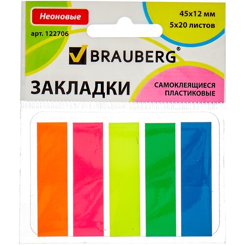 Закладки клейкие BRAUBERG неоновые, пластиковые, 45х12 мм, 5 цветов х 20 листов, на пластиковом основании, 122706