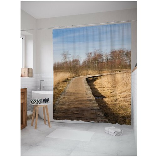 Штора занавеска) для ванной JoyArty Дорога в осень из сатена, 180х200 см с крючками