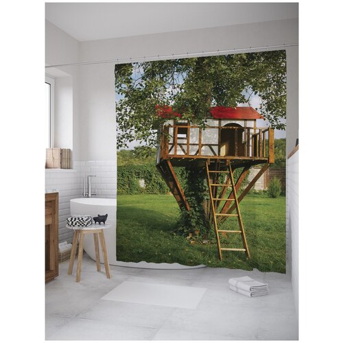 Штора занавеска) для ванной JoyArty Домик на дереве из сатена, 180х200 см с крючками