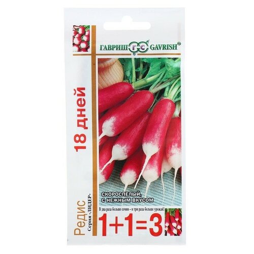 Семена по типу: Семена Редис 143;1 34;18 дней34;, 5,0 гГабариты: 15 см х 8 см х 0,5 смКоличество упаковок в заказе, шт: 1Дополнительные характеристики: Скороспелый 1820 дней от всходов до технической спелости), урожайный сорт. Корнеплод удлиненноцилиндрический с розовой верхней частью и белым кончиком. Мякоть белая, плотная, слабоострая. Масса товарного корнеплода 17 г. Ценность сорта: скороспелость, дружное формирование корнеплодов, высокий выход товарной продукции и отличные вкусовые качества. Выращивают прямым посевом в открытый грунт. Посев проводят в конце апреляначале мая на глубину 1 см по схеме 57x15 см. Повторные посевы в середине июля позволяют получить еще больший урожай в августесентябре. Урожайность до 2,3 кгм2.Агрономический срок годности, лет: 4
