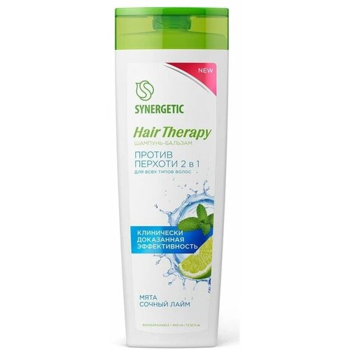 Шампуньбальзам SYNERGETIC Против перхоти 2 в 1 HAIR THERAPY эффективно очищает и ухаживает за волосами и кожей головы. Активный компонент пропандиол каприлат устраняет перхоть и предотвращает е появление, не раздражая чувствительную кожу головы. Цинк стабилизирует работу сальных желз и улучшает состояние кожи головы, оставляя ощущение свежести надолго. Растительные компоненты сахарид изомерат и бетаин способствуют длительному увлажнению и смягчению кожи головы, улучшая е состояние. Сок лайма, мята и протеины пшеницы укрепляют волосы и восстанавливают их структуру, улучшая внешний вид. Мультифункциональный компонент натурального происхождения софоролипид мягко очищает и сохраняет естественный микробиом кожи. Инновационный увлажняющий комплекс усиливает барьерные свойства кожи за счт глубокого увлажнения до 72 часов. Физиологичный уровень pH 5,5 способствует устранению сухости кожи головы и гарантирует безопасность при частом использовании средства даже для чувствительной кожи. Эффективность шампуня при регулярном использовании подтверждена аккредитованным испытательным центром.