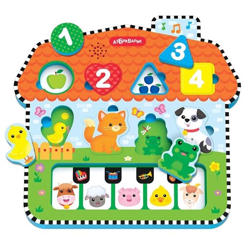 Уникальная развивающая игрушка 3 в 1: пазлвкладыш музыкальный планшетик пианино! Игрушка изготовлена из легкого мягкого материала EVA, с которым удобно и приятно играть.Доставая и вставляя мягкие фигурки в нужные окошки, малыш познакомится со зверюшками, выучит цифры и формы. Все картинки говорящие и музыкальные. Нажимая на них, ребенок запомнит голоса животных, звуки музыкальных инструментов, послушает песенки про зверят Смешной цыплнок, Песенка котнка, Лягушкапопрыгушка, Маленький щенок, Коровка на лугу, Кудрявая овечка, Лг пороснок на бочок, Утнок пока не умеет нырять, Ходит козочка по кочкам) и веселые мелодии.