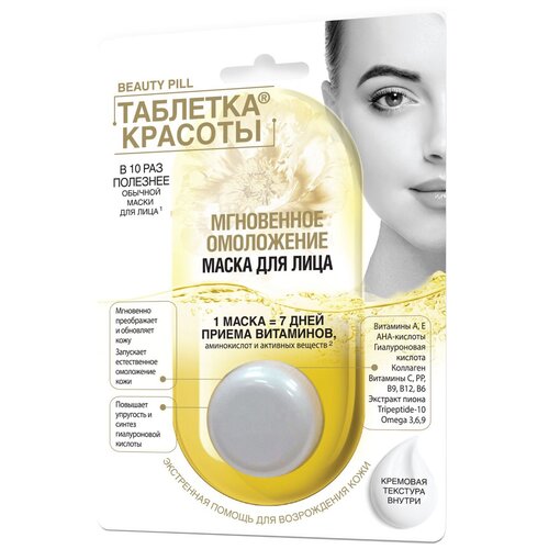 1 маска 7 дней приема витаминов, аминокислот и активных веществ. Экстренная помощь для возрождения кожи. Маска для лица Мгновенное омоложение эффективное средство для моментального обновления и преображения кожи. Благодаря AHAкислотами и витаминам молодости маска борется сразу с 5 признаками возрастных изменений и возвращает лицу свежесть, гладкость и прекрасный вид. Мгновенно преображает и обновляет кожу. Запускает естественное омоложение кожи. Повышает упругость и синтез гиалуроновой кислоты. Витамин А, Витамин Е, Гиалуроновая кислота, Коллаген, Витамины С, РР, В9, В12, В6, эксракт пиона, Omega 3,6,9, Tripeptide10. Гиалуроновая кислота , Omega 3, Omega 6 и коллаген восстанавливают упругость кожи, способствуя продлению молодости кожи и ее уплотнению. Витамины А и Е сильнейшие антиоксиданты, эффективно борются с возрастными изменениями. Витамины В6, В9, В12 стимулируют выведение токсинов, блокируют процессы гликации и замедляют образование морщин. Витамин С и АНАкислоты обновляют кожу, стимулируют регенерацию, повышают синтез коллагена и борются с пигментацией. Экстракт пиона и Витамин РР повышают насыщение кожи кислородом. Tripeptide10 способствует повышению эластичности кожи. Натуральные витамины прямого действия разработаны в Германии, они легко усваиваются кожей, действуют быстро и эффективно. Результат после первого применения: Запускаются омолаживающиеся процессы синтез коллагена, регенерация и насыщенность антиоксидантами), кожа наполнется влагой и витаминами, приобретает гладкость и упругость. Результат при постоянном применении: На 100 здоровая и красивая кожа. Возобновляются ресурсы молодости кожи, повышается способность кожи удерживать влагу, сокращаются морщины, кожа выглядит значительно моложе. Состав: Aqua, Paeonia Lactiflora Flower Extract Экстракт Пиона), CaprylicCapric Triglycerides, Hydrolyzed Yeast Extract, Cetyl Hydroxyethylcellulose, Polyglucuronic Acid, Lecithin) разглаживающий комплекс OptimHyal), Cetearyl Alcohol, Glyceryl Stearate, Glyceryl Linoleate, Glyceryl Oleate, Glyceryl Linolenate) Omega 3, 6, 9), Biotin Витамин В7), Folic Acid Витамин B9), Cyanocobalamin Витамин В12), Pantothenic Acid Витамин В5), Pyridoxine Витамин B6), Riboflavin Витамин B2), Thiamine HCL Витамин B1), Magnesium Ascorbyl Phosphate Витамин С), Hydrolyzed Collagen, Hyaluronic AcidГиалуроновая Кислота), Niacinamide Витамин РР), Tocopheryl Acetate Витамин Е), Lactic Acid, Citric Acid AHAкислоты), Retinyl Palmitate Витамин А), Alanine, Tripeptide10 Пептиды), Xanthan Gum, Sodium Stearoyl Glutamate, Parfum, Benzyl Alcohol, Ethylhexylglycerin. Способ применения: Нанесите маску плотным слоем на предварительно очищенную кожу лица. Оставьте на 1520 минут. Смойте теплой водой. После применения используйте увлажняющий крем. Обновляющий эффект маски длится в течение 28 часов после применения. Использовать 23 раза в неделю. Меры предосторожности: Для наружного применения. Хранить в недоступном для детей месте. При попадании в глаза промыть водой. Возможна индивидуальная непереносимость компонентов. Изготовитель: ООО 34;Фитокосметик34;