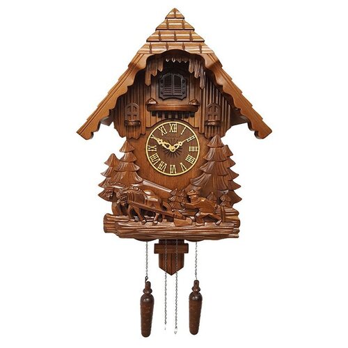 Настенные часы с кукушкой Columbus CQ020 34;Земледелец34; Часы с кукушкой Columbus CQ020 34;Земледелец34; имеют надежный кварцевый механизм и светочувствительный элемент, который автоматически переводит часы в ночной режим работы в темноте кукушка не срабатывает). Корпус часов выполнен из дерева. Циферблат и стрелки вырезаны из дерева метод лазерной резки). Римские цифры. Фронтон ручной работы, вырезан из липы. Часы вырезаны в виде домика с крышей и окнами с обеих сторон. Внизу еловый лес c Земледельцем пахарем) с лошадью. Маятник, гири шишки. Характеристики часов с кукушкой Columbus CQ020: Размер: 76х40.5х18.5 см в собранном виде с учетом длины цепи и гирь) Материал корпуса дерево. Режим автоматического отключения 34;кукушки34; в ночное время. Питание: 2 элемента типа D R20). Производство: Китай.