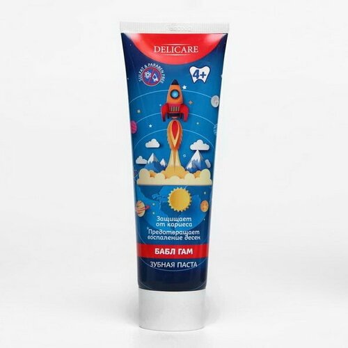 Артикул: 1254732. Вес: 108 гр., Применение: Защита от кариеса, Особенности состава: Без парабенов, Размер упаковки: 3 x 15.5 x 5 см., Возраст: Для детей. Описание: детская зубная паста Delicare Bubble Gum разработана специально для детей от 4 лет. Зубная паста на основе силики бережно счищает налет, не травмируя неокрепшую эмаль детских зубов. Экстракт ромашки оказывает успокаивающее действие, экстракт календулы питает десны витаминами и микроэлементами. Экстракт лимона, богатый витаминами С, В1, В2, РР, позволяет сохранить естественную белизну зубов.Состав: вода, ромашки экстракт, календулы экстракт, сорбит, камедь ксантовая, фторид.Действие пасты: детская, очищающая.Назначение косметического средства: гигиена полости рта.Срок годности: 18 месяцев.