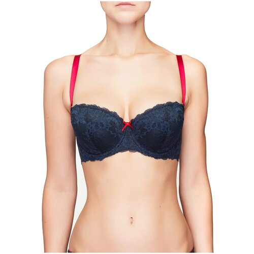 Бюстгальтер “балконет” на каркасах и стане из эластичного кружева. В основе чашки конструкция из трёх деталей. Чашки на дубляже с хлопком и с вкладышами в боковой части чашки, которые помогают поднять и сгруппировать к центру грудь, и создать красивое декольте. Для лучшей функциональности во всех размерах боковые детали стана дополнительно продублированы эластичным сетчатым полотном. Бретели можно отстегнуть и заменить на прозрачные. Бюстгальтер дополнен бантиком из атласной ленточки.