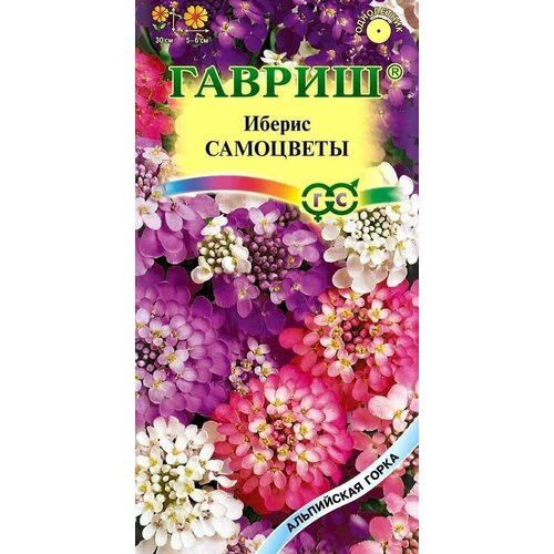 Семена гавриш Альпийская горка, Иберис Самоцветы однолетние низкорослые растения высотой 25см, за короткий срок разрастаются и образуют шапки ароматных зонтиковидных соцветий диаметром 56см) разнообразных окрасок, преимущественно фиолетовых и голубых тонов. Неприхотливые, зимостойкие, предпочитают дренированные легкие суглинистые почвы на хорошо освещенных местах. Оптимальная для прорастания семян температура почвы 43;1820. Рекомендуется для бордюрных обсадок, миксбордеров, рокариев, оформления края садовых дорожек.