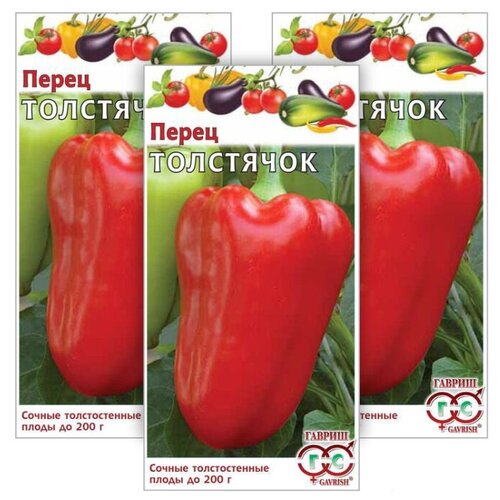 Комплект семян Перец Толстячок х 3 шт. Среднеспелый 115118 дней от всходов до технической спелости) сорт. Рекомендуется для выращивания в открытом грунте и пленочных теплицах. Посев на рассаду в конце февраля. Пикировка в фазе семядолей. Высадка рассады в грунт в конце мая. Формировка: удаление всех боковых побегов и листьев до первой развилки. Отзывчив на регулярные поливы. Растение полураскидистое, высотой 5055 см. Лист среднего размера, зеленый, морщинистый. Плоды пониклые, призмовидной формы, слаборебристые, глянцевые, окраска в технической спелости зеленая, в биологической красная. Длина плода 1012 см, диаметр 6,58 см, толщина стенки 5,010,0 мм. Средняя масса плода 65130 гр, максимально до 200 г. Вкус отличный. Плоды отличаются транспортабельностью. Схема посадки 40x60 см. Урожайность 44,5 кгм2.