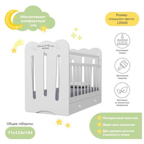 Кровать детская Desire маятник с ящиком белый) 1200х600)Кровать детская ВДК Desire маятник с ящикомУютная кроватка, выполненная в приятном цвете, украсит детскую комнату и подарит полноценный отдых вашему ребенку. Модель имеет поперечный маятниковый механизм качания. Реечное дно ложа фиксируется на двух уровнях высоты.В нижней части кровати расположен вместительный выдвижной ящик закрытого типа, в него легко поместятся игрушки или детские вещи.Особенности:Изготовлена из массива дерева с использованием современных технологий.Покрыта нетоксичным и безвредным для здоровья детей лаком на водной основе.Боковая стенка опускается для удобства родителей и крохи.Ложе в два положения по высоте.Конструкция проста в эксплуатации.Эргономичные формы гарантируют безопасность и комфорт в использовании.Характеристики:Размер спального места: 120х60 см.КомплектацияДля удобного пеленания малыша рекомендуем пеленальные доски: Доска пеленальная Медвежонок Винни. Чудесный день для детских кроватей Доска пеленальная Параллель. Классика, цвета микс Доска пеленальная Параллель, цвета микс Доска пеленальная Polini Kids Единорог Сладости, для детских кроватей, розовыйСостав: Дерево, ЛДСП