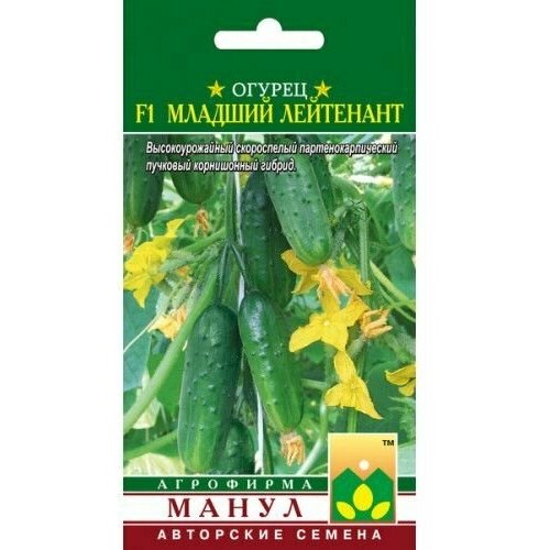 Огурец F1 Младший лейтенант выскоурожайный скороспелый партенокарпический пучковый корнишонный гибрид женского типа цветения для открытого и защищенного грунта. Характеризуется интенсивным ростом, обилием завязей, хорошим отрастанием боковых побегов в сочетании со 2м типом саморегулирования ветвления. В узлах формируется от 23 до 57 и более завязей. Завязей на растении так много, что гибрид можно выращивать для сбора и консервирования микропикулей 35дневных завязей длиной 35 см). Зеленцы яркозеленые, бугорчатые, белошипые, длиной 912 см, с хрустящей мякотью. Частота расположения бугорков средняя. Засолочные, вкусовые и консервные качества высокие. Гибрид устойчив к мучнистой росе, оливковой пятнистости, вирусу обыкновенной огуречной мозаики, толерантен к ложной мучнистой росе.Плотность посадки в теплицах 2,5 раст.м2, в открытом грунте 34 раст.м2.