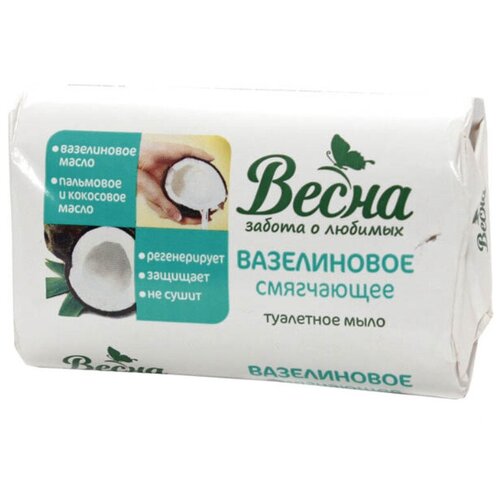 Мыло туалетное Вазелиновое для сухой кожи образует мягкую, нежную, пену, обладает легким ароматом. Кусковое мыло для рук и тела изготовлено с применением природных компонентов и добавлением вазелина. Вазелиновое масло в составе мыла способствует смягчению, увлажнению, создает тонкую защитную пленку и предотвращает пересушивание эпидермиса. Мыло для душа ухаживает, очищает дерму, устраняет сухость, шелушение и раздражение. Мыло в брусках дарит чувство увлажненности, напитанности, эластичности, быстро вспенивается, легко смывается, не оставляет липкости, стянутости, идеально для всей семьи. Туалетное мыло вазелиновое рекомендовано для сухой, чувствительной кожи, подходит для повседневного использования, обеспечивает бережное очищение и ощущение чистоты, свежести в течение всего дня. Оригинальное мыло Весна исключает наличие в составе некачественных материалов. Мы внимательно относимся к качеству товаров. Пожалуйста, не стесняйтесь оставлять отзывы! Мы реагируем на каждый отзыв.