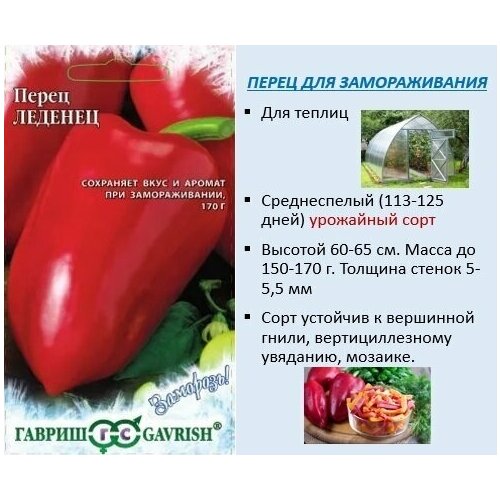 Среднеспелый 113125 дней) урожайный сорт. Рекомендован для выращивания на приусадебных участках и в пленочных теплицах. Растение полураскидистое, хорошо облиственное, высотой 6065 см. Плоды выравненные, конусовидные с тупым кончиком, слегка ребристые, очень крупные, транспортабельные. Масса до 150170 г. Толщина стенок 55,5 мм. Окраска плодов в технической спелости светлозеленая, в биологической красная. Сорт устойчив к вершинной гнили, вертициллезному увяданию, мозаике. Плоды отлично подходят для замораживания, при длительном хранении в морозильной камере сохраняют аромат. Перец сладкий Леденец, 0,2г, Гавриш, Заморозь!