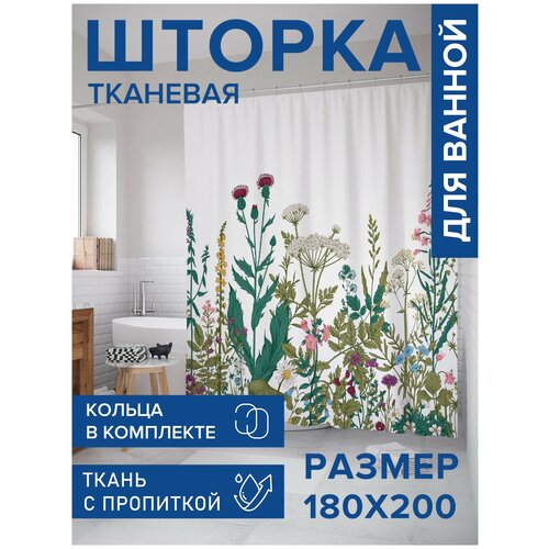 Штора водоотталкивающая для ванной, занавеска в ванную комнату тканевая JoyArty Ряд лекарственных растений, 180х200 см