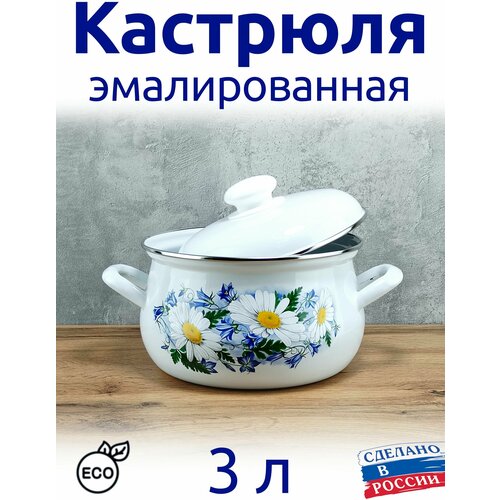 Кастрюля эмалированная 3 л Грушевидная с крышкой, белая с рисунком