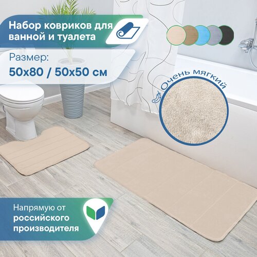 Набор ковриков для ванной комнаты и туалета с вырезом 50х80 , 50х50 см VILINA мягкие текстильные противоскользящие ворсовые однотонные светлобежевый
