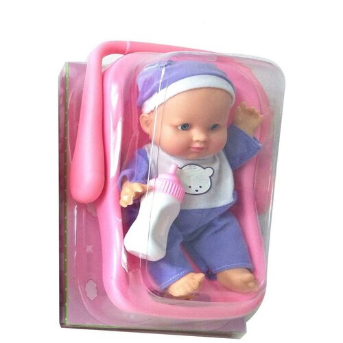 Этого милого пупсика из серии "Мой малыш" девочка всегда может взять с собой. Ведь в комплекте с ним идет удобная большая розовая переноска. Пупс одет в бело-голубые комбинезон и шапочку, у него подвижные голова, руки и ноги. Дополняет набор бутылочка. В состав набора входят: пупс 23см переноска 24х16см бутылочка.