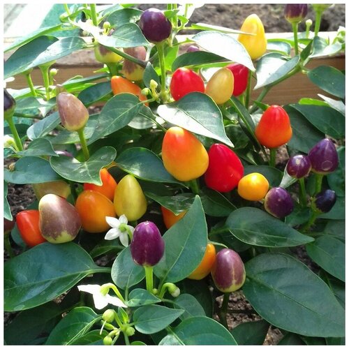 Перец острый Пиковая дама лат. Capsicum annuum).Комплектация: Семена в количестве 5 шт. в Ziplock пакете, подарочные семена. Среднеспелый, урожайный сорт острого перца, предназначенный для круглогодичного выращивания, в зимнее время в горшечной культуре на подоконнике, в летнее в открытом грунте. Куст среднеоблиственный, округлой формы, высотой 2030 см. Несмотря на декоративные свойства, растение неплохо плодоносит в течение 56 лет.Конусовидные плоды, торчащие вверх, по мере созревания приобретают различную расцветку фиолетовую, желтую, оранжевую и в стадии полной зрелости темнокрасную. Длина перчика 1012 см, средний вес 12 г. Плоды обладают острым вкусом, с сильным ароматом.По шкале Сковилла степень жгучести 50150 тыс. единиц.Плоды острого вкуса используют в качестве приправы к блюдам, для изготовления порошка и при консервировании.Инструкция:Перед посадкой семена нужно подготовить: опустить их на полчаса в слабый раствор марганцовки, а потом завернуть во влажную ткань и ждать при температуре 25 C, пока они не проклюнутся. После этого осторожно заделывают во влажную почву на глубину 510 мм, соблюдая расстояние между ними не менее 5 см, накрыть пленкой или стеклом и поместить в теплое место. Как только начнут показываться всходы, посевы нужно переставить на свет. И не забывайте поддерживать субстрат в слегка влажном состоянии, в то же время не допуская его переувлажнения. Время от времени между сеянцами желательно рыхлить почву. На стадии развития у рассады двух пар настоящих листьев нужно распикировать сеянцы в неглубокие горшочки диаметром 810 см. Перед началом процедуры рассаду поливают. До высадки в грунт рассаду острого перца подкармливают дважды через две недели после пикировки и через две недели после первой подкормки.Посадка острого перца в открытый грунт осуществляется на стадии формирования у сеянцев первых бутонов. Обязательным условием является также установление среднесуточной температуры на уровне 1517 C. За две недели до высадки рассада острого перца подвергается закаливанию: ежедневное выгуливание сеянцев на открытом воздухе, начиная с 1520 минут, постепенно увеличивая продолжительность.