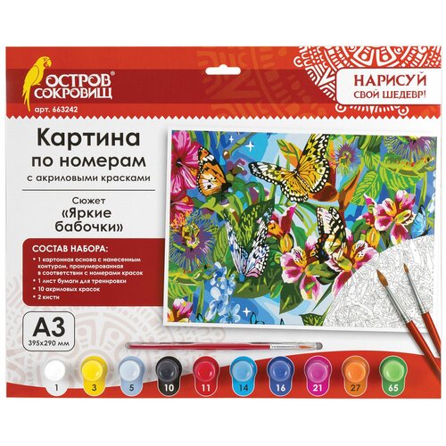 Остров сокровищ Картина по номерам А3, остров сокровищ Яркие бабочки, акриловые краски, картон, 2 кисти, 663242