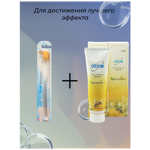 Зубная паста Atomy на основе прополиса прекрасно ухаживает за деснами, укрепляет и отбеливает зубы. Атомы прополиса, содержащиеся в пасте, эффективно освежают дыхание, убивает бактерии в ротовой полости, удаляют зубной налет, предотвращают кариес и зубной камень.Атоми Зубные Щетки Atomy Toothbrush)Это сверхтонкая щтка с тонкими и гибкими щетинками, со скругленной головкой, удобная в использовании. Мягкая и гибкая щетина толщиной 0,18 мм эффективно удаляет остатки пищи и налета, обеспечивает ощущение свежести.